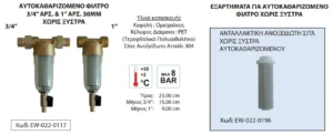 Κατηγορίες: Αυτοκαθαριζόμενα φίλτρα, Επεξεργασία νερού, Φίλτρα κεντρικής παροχής